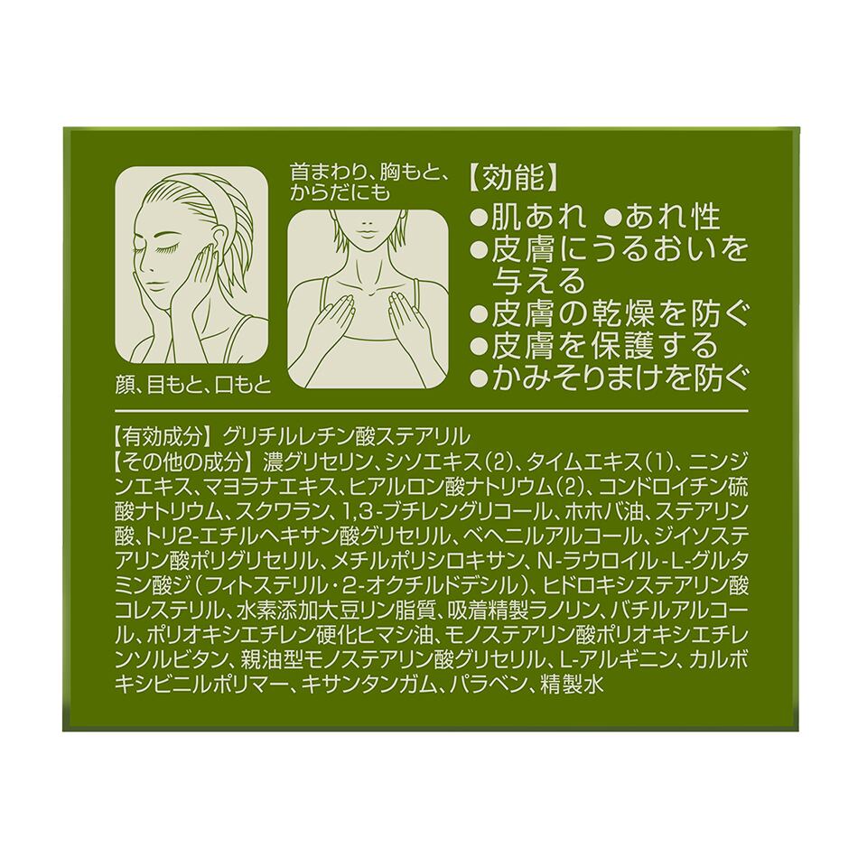 その他の成分:濃グリセリン、シソエキス(2)、タイムエキス(1)、ニンジンエキス、マヨラナエキス、ヒアルロン酸ナトリウム(2)、コンドロイチン硫酸ナトリウム、スクワラン、1,3-ブチレングリコール、ホホバ油、ステアリン酸、トリ2-エチルヘキサン酸グリセリル、ベヘニルアルコール、ジイソステアリン酸ポリグリセリル、メチルポリシロキサン、N-ラウロイル-L-グルタミン酸ジ(フィトステリル・2-オクチルドデシル)、ヒドロキシステアリン酸コレステリル、水素添加大豆リン脂質、吸着精製ラノリン、バチルアルコール、ポリオキシエチレン硬化ヒマシ油、モノステアリン酸ポリオキシエチレンソルビタン、親油型モノステアリン酸グリセリル、L-アルギニン、カルボキシビニルポリマー、キサンタンガム、パラベン、精製水